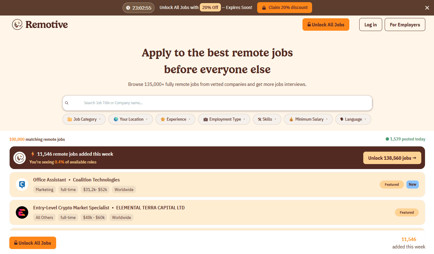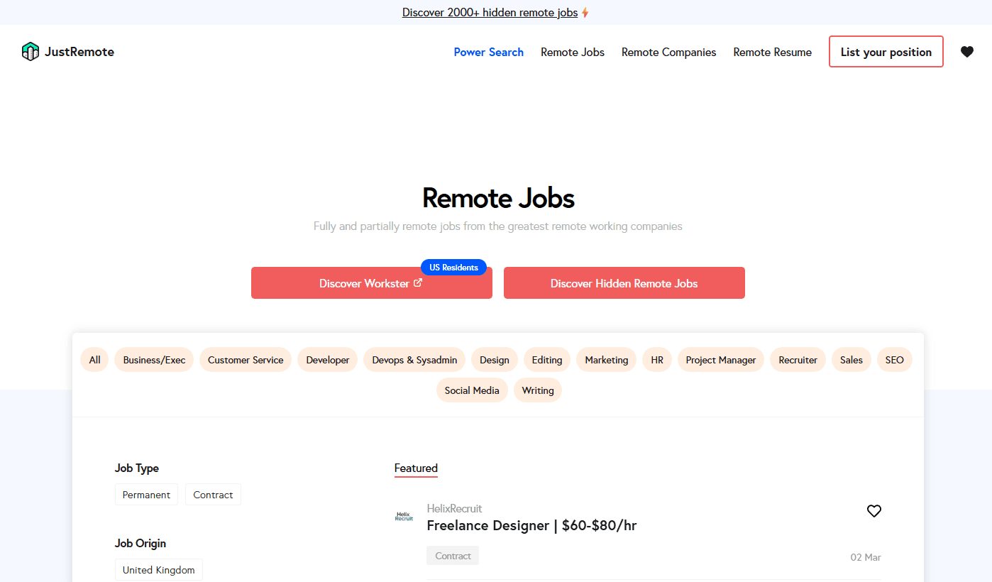A remote job platform covering a wide range of roles including design, marketing, and development.